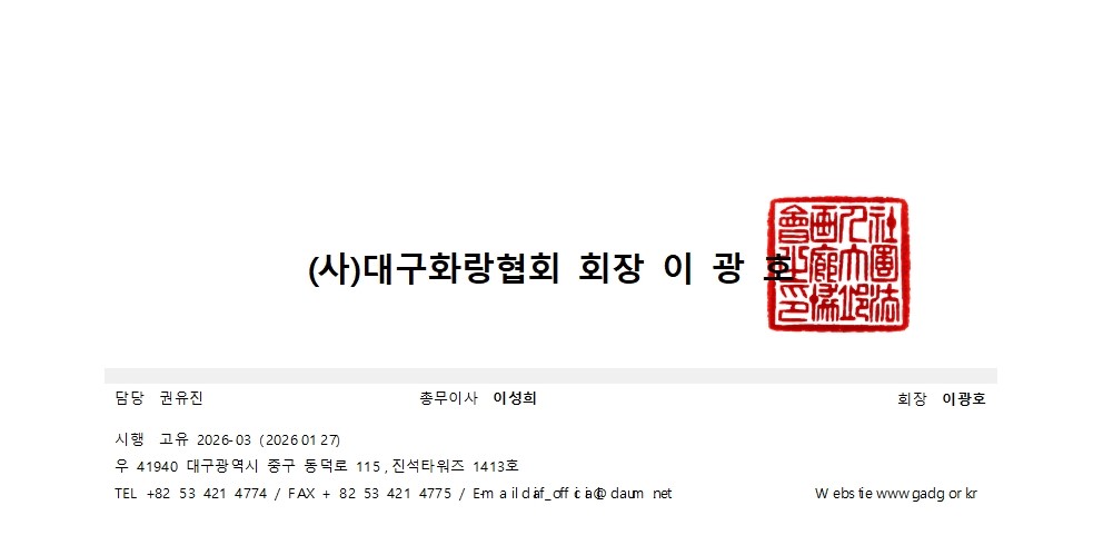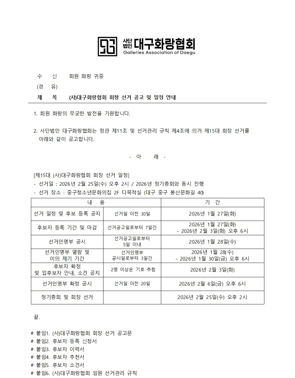 | [공고] (사)대구화랑협회 제 15대 회장 선거 공고 및 일정 안내 2026.01.27 |